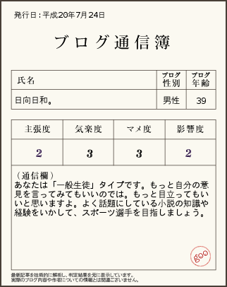 NTTレゾナントが運営する「goo」は7月23日、ブログ記事をもとにブロガーの年齢や性別、影響度などを推定し、“通信簿”として表示する「ブログ通信簿」の実験を「gooラボ」で始めた。(後略)